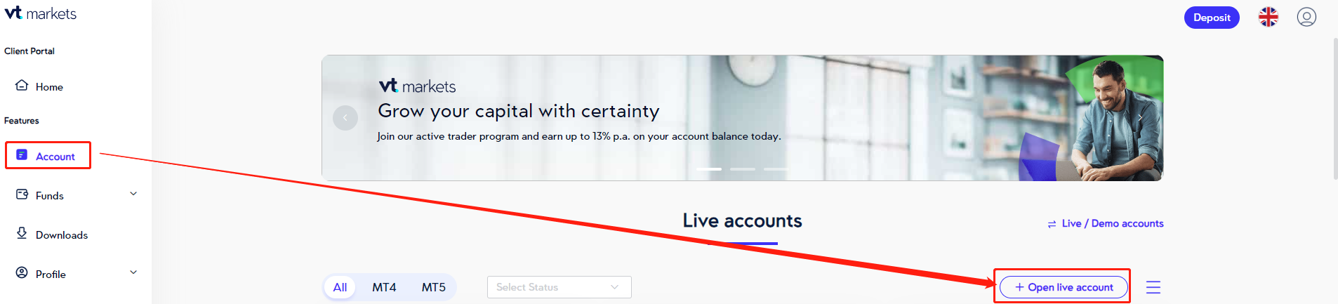 For the VT Markets App, simply navigate to the "Order Page" and click "Account" on the upper side to get into the account management page, then click "Add Account" to request a new additional trading account.