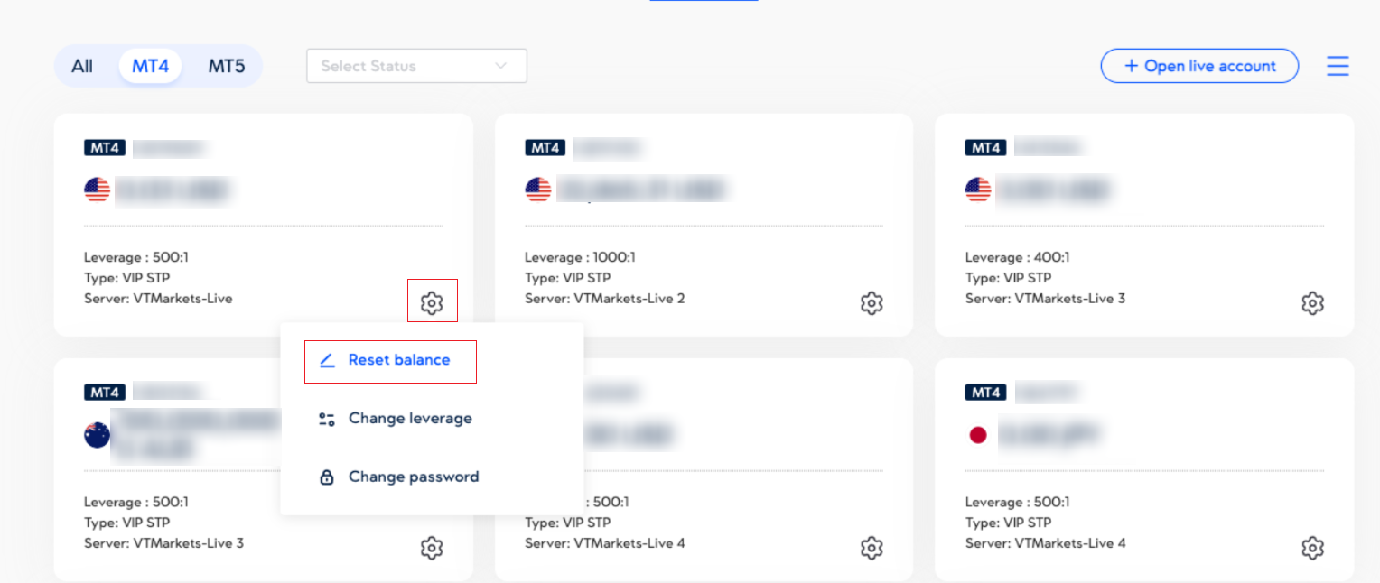 3. Select "Setting" at the far right of your MT4/5 account and click the "Reset balance"